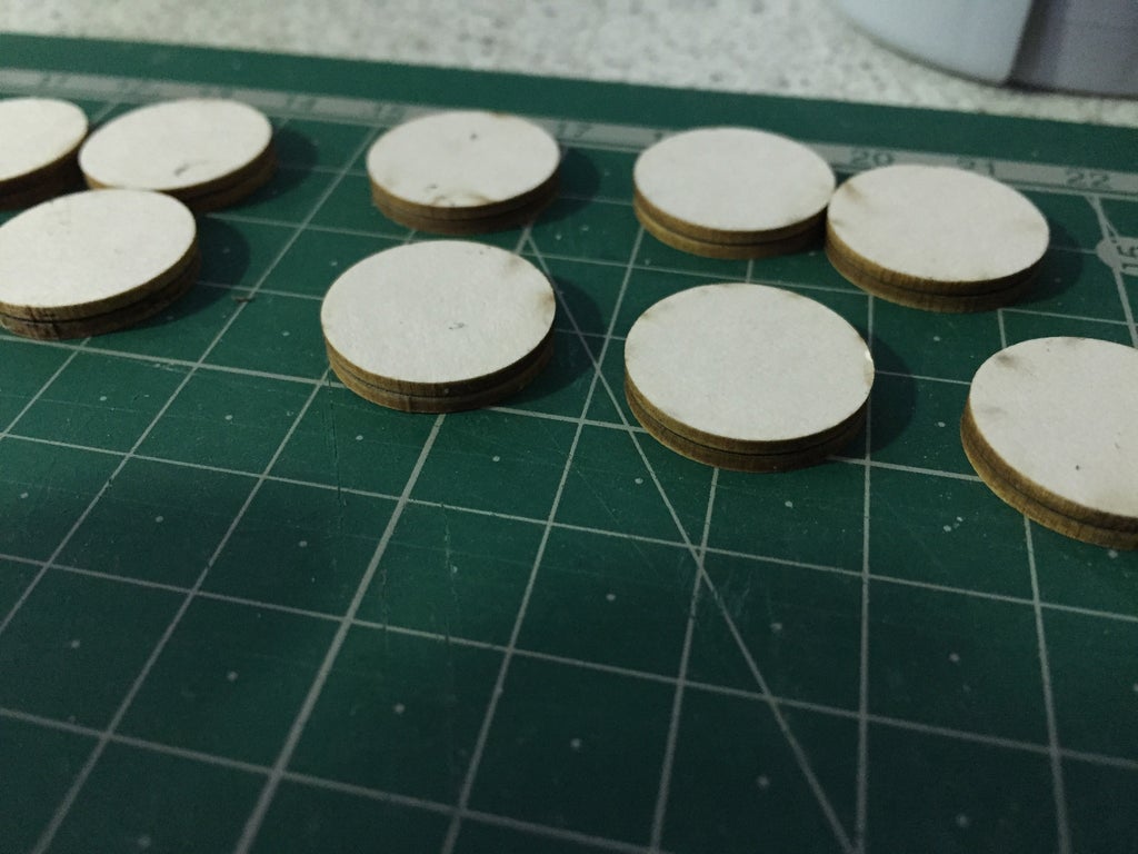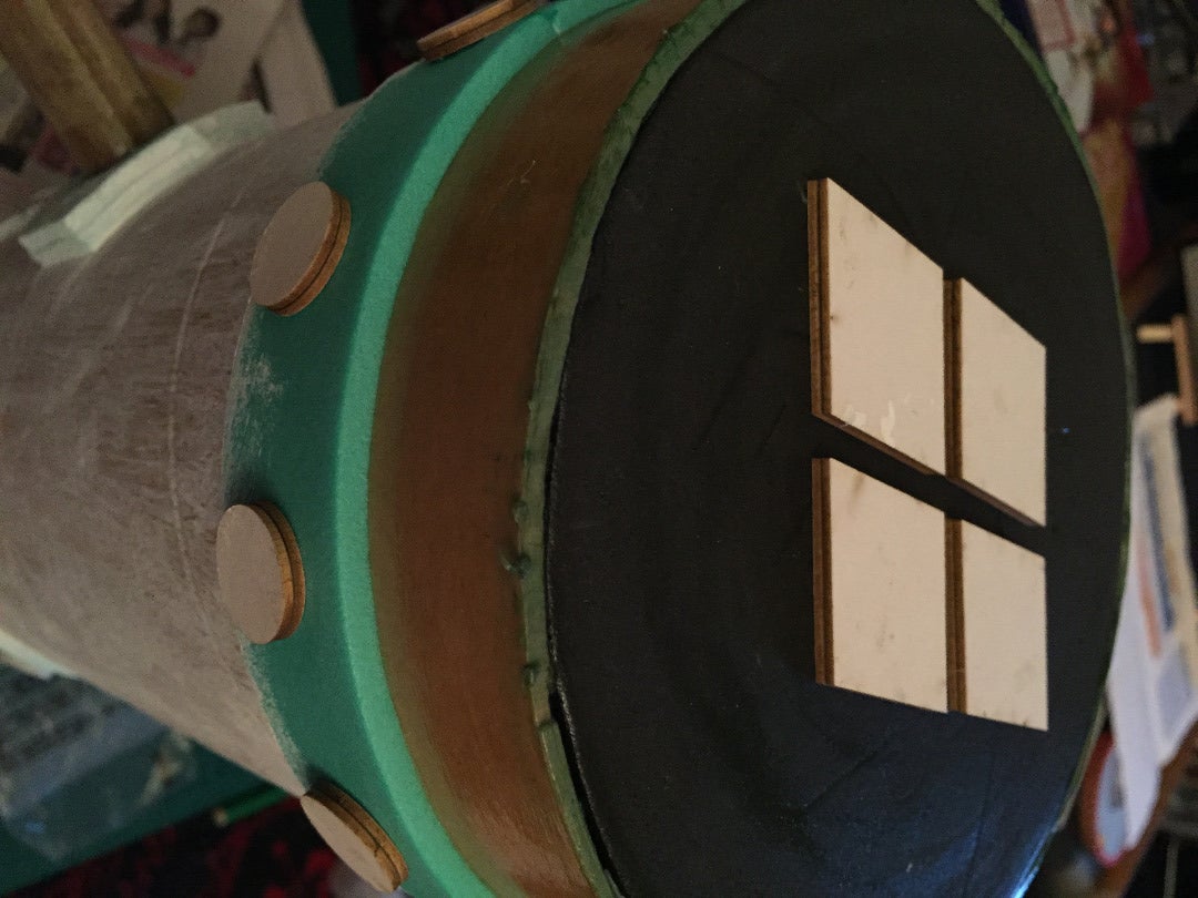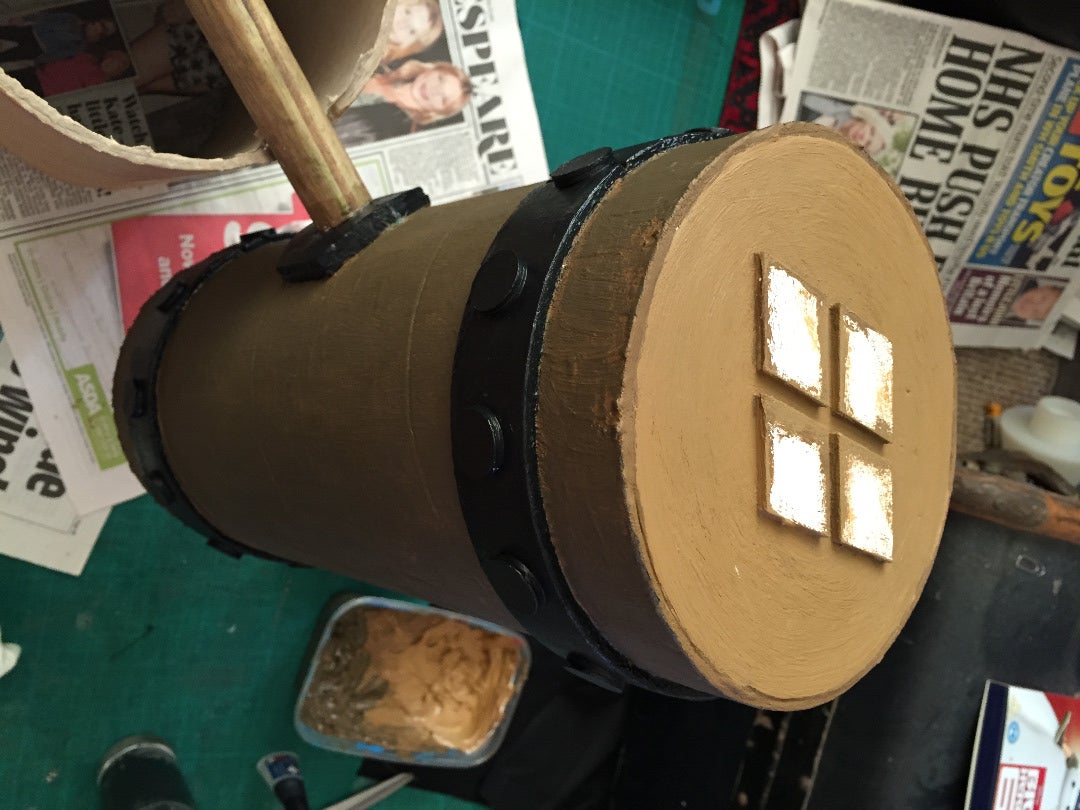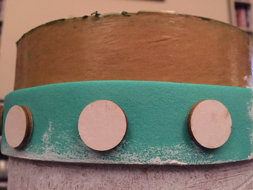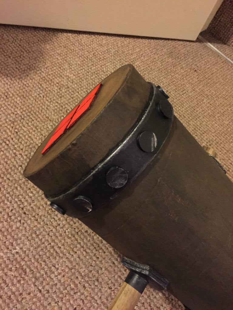 To make the band around the hammer look like a metal band that has been hammered and nailed on to the wooden hammer i cut some card discs out of 1.2 mm card stock and glued two together and glued them around the band at intervals of somewhere between 35mm and 40mm, this was to make it look like they had been nailed into the hammer slightly randomly by Harley Quinn.