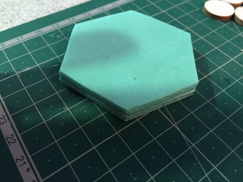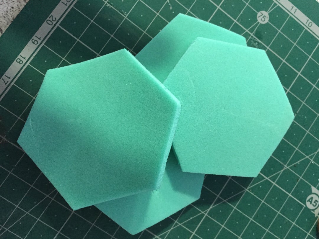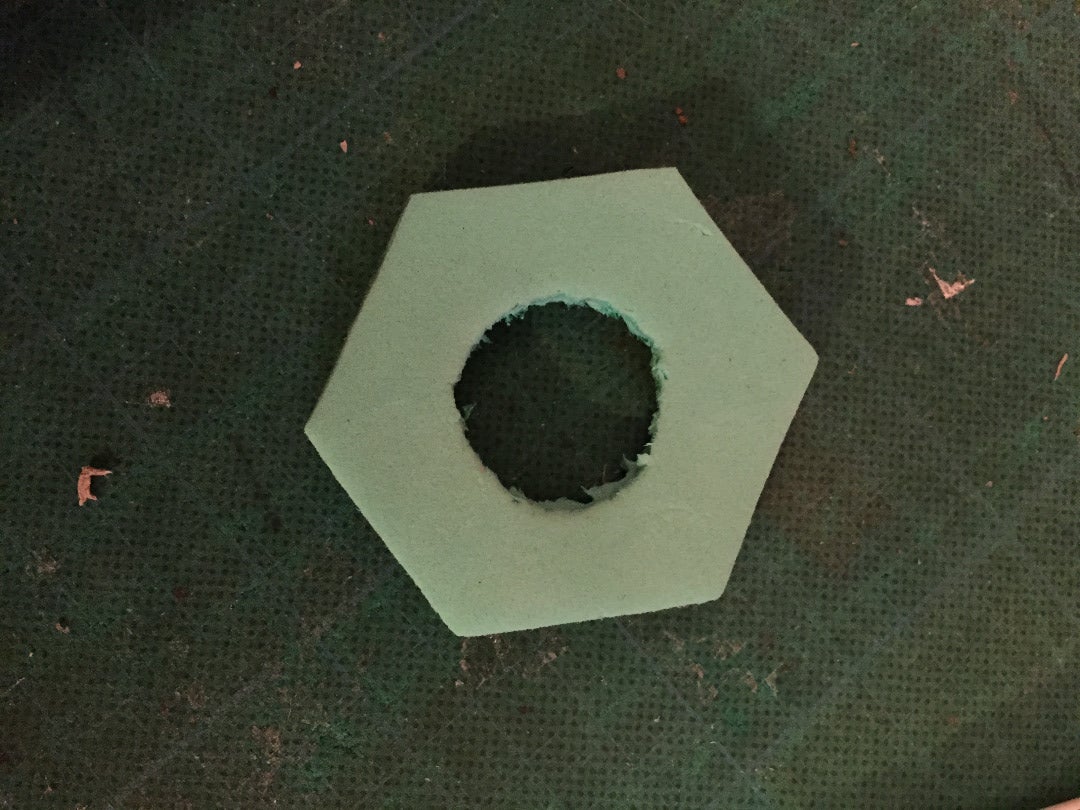 Using the same thin EVA foam I cut 4 Hexagons, I glued two of them together to make it thicker, (i didn't use the 10mm EVA as it is textured on one side and this wouldn't have made for a good surface to glue to the curve tube) when the glue had dried i cut a hole in the middle to go over the handle and the hole to make it look like it had been bolted on.