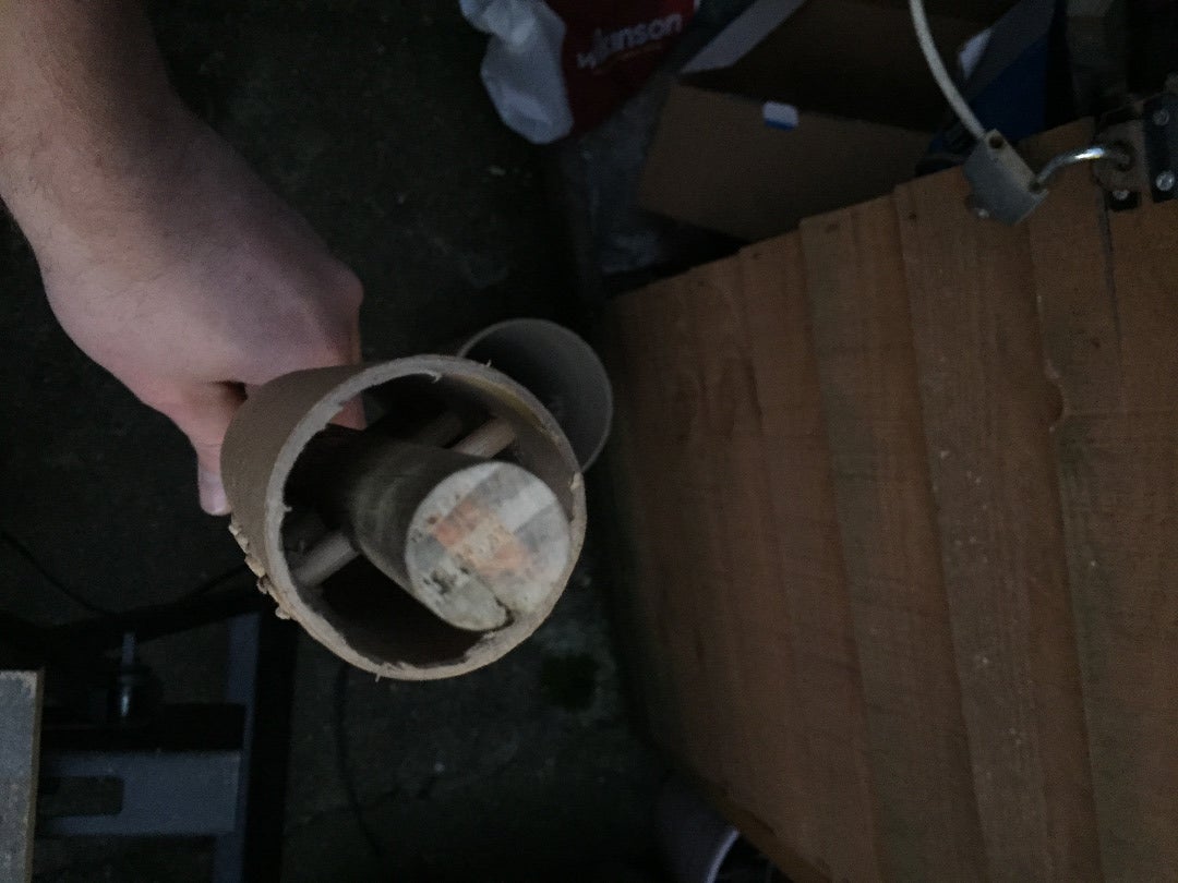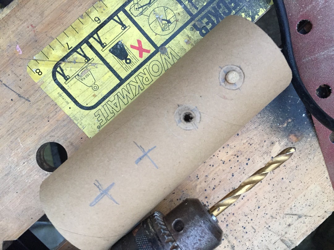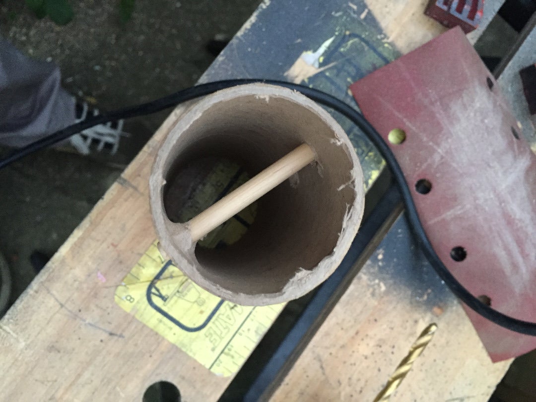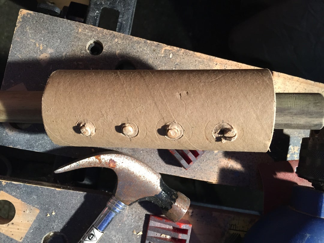 Marked four spots along the side of the tube and drilled a 6mm hole through the tube and the broom handle the wooden dowel will go through the tube and the handle to secure it inside the main tube.