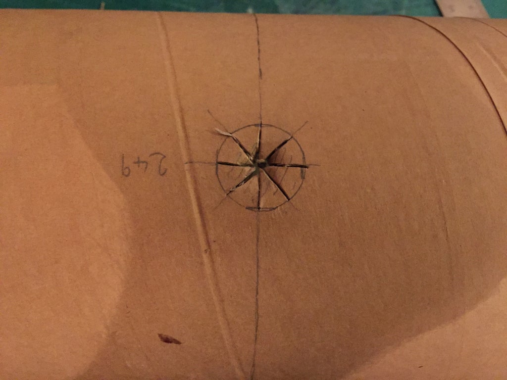 To cut the holes for the handle i drew 4 lines through the circle and cut these spokes and then carefully cut around the circle and pushed the slices into the tube.