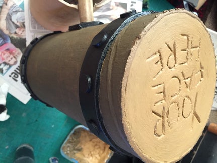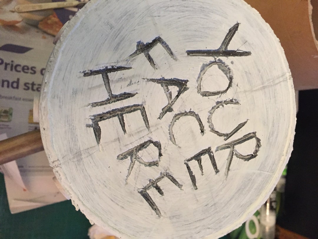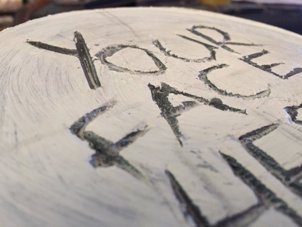 I thinned down some black acrylic paint and painted it into the valleys of the words i carved out of one end.
