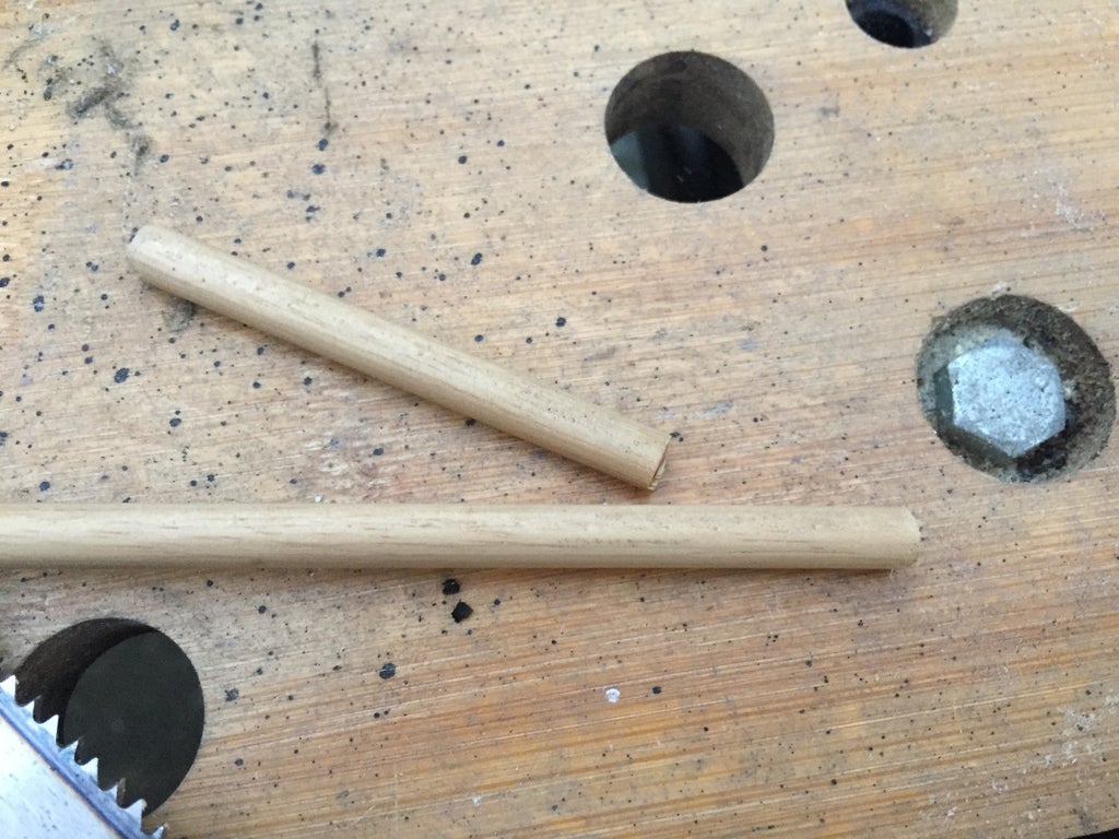 I put the small tube in the large one over the holes, then inserted the handle into the main tube and lined up the four holes and pushed the pegs through all the holes. Adding a little glue to the pegs before to get glue through the holes to secure the pegs to the tube.