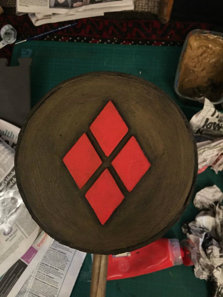 To make the Harley Quinn logo i did a similar thing to the discs, i cut out 8 diamonds and glued two together and then glued them onto one of the hammer ends.