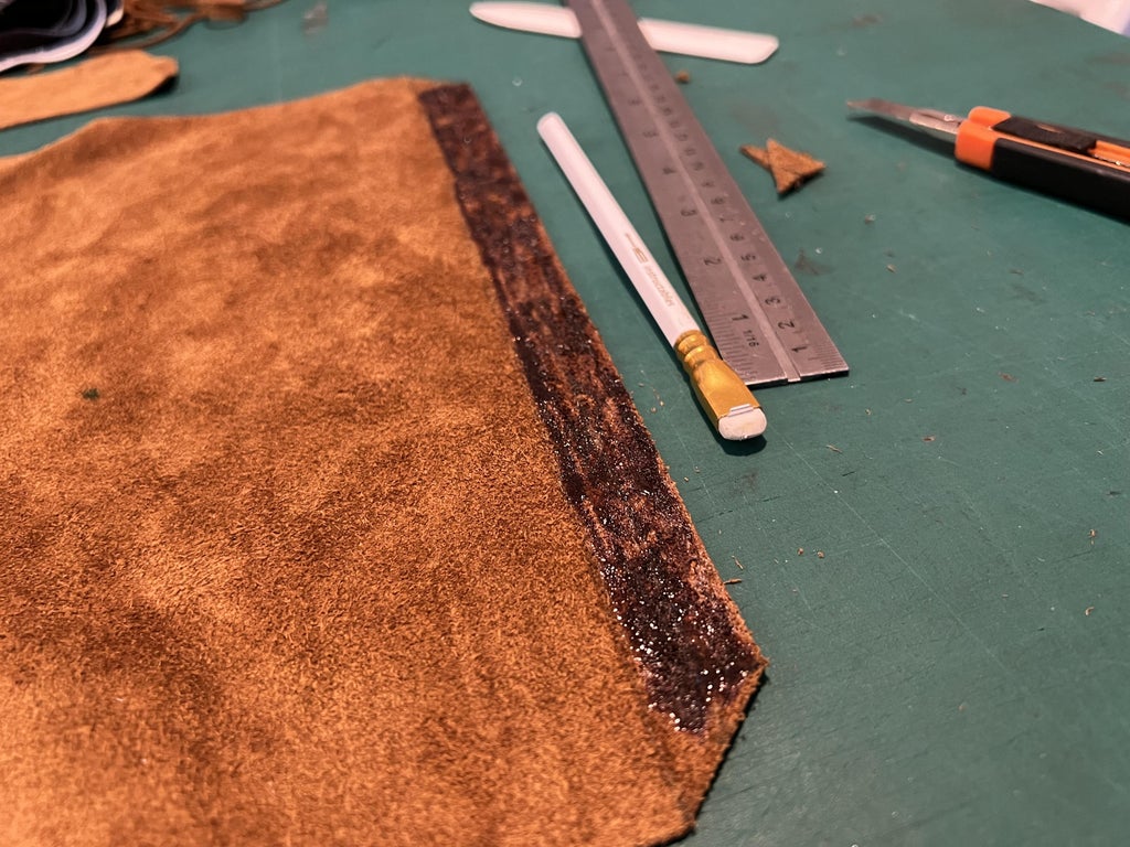 I did each edge of the leather at a time, by spreading the glue along the folding part and the area its going to be folded onto. Working my way around the cover I glued each side at a time.