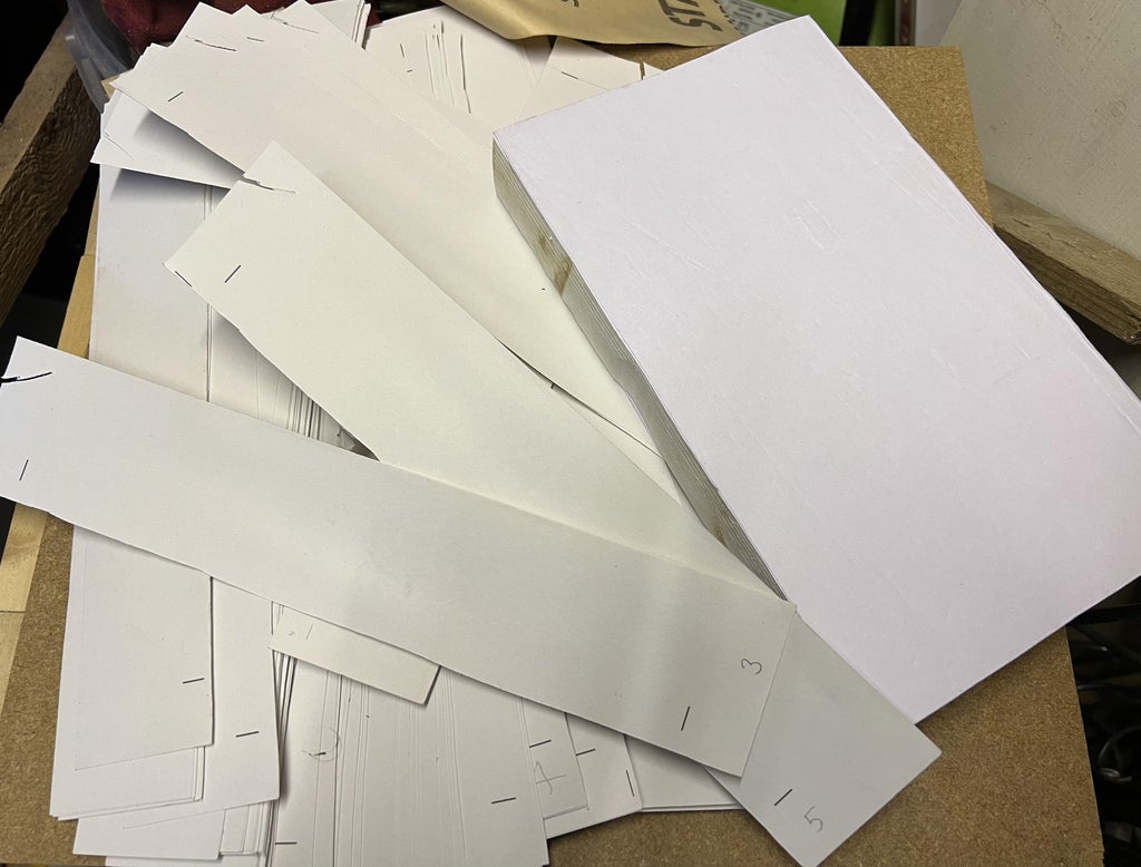 Using the page numbers and the image of the signature layout, I collated the prints in to their signatures and folded them all along the centre reg marks.