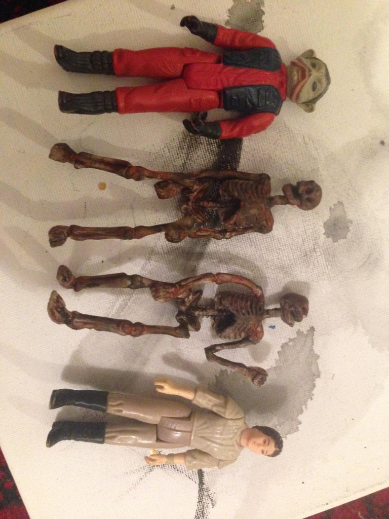 Once the glue had dried and the plastic had cooled i used acrylic paint to darken the skeletons down to make them look like they had been burned by some evil stormtroopers. once the layers of brown and dark red paint had dried i gave it a little coat of bright red to make them look a little bloody.