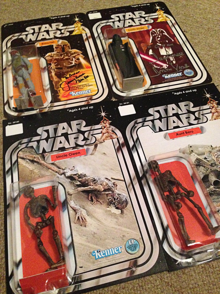I have made a display case for the little fellas, I had the pleasure to meet David Prowse and Jeremy Bulloch last year, knowing i was going to meet them i wanted to get something unique for them to sign for my collection so i looked into Re-carding my vintage Darth Vader and Boba Fett figures. and doing so with the re-card kit i thought it would be fun to make some custom figures from the films using similar techniques.